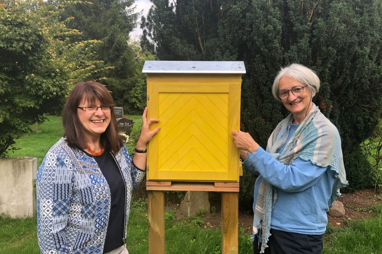 Am Tag des "Offenen Friedhofs", So. 19.09.2021, von 15.00-17.00 Uhr präsentieren Imkerin Dorothea Tilge und Friedhofwartin Dörte Rausch den neuen Bienenschaukasten direkt hinter der Andreaskirche und beantworten alle Ihre Fragen rund um Bienen und bienenfreundliche Pflanzen.